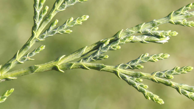 Species of the cypress family have scales. These are flattened and shield-shaped that overlap on the twig.